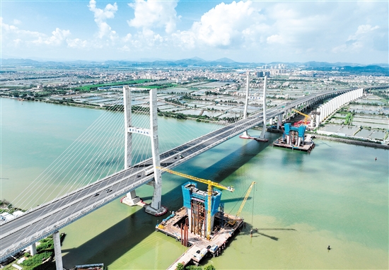 ??? 9月1日,中鐵建大橋局承建的深江鐵路關(guān)鍵性工程跨磨刀門水道主橋東主墩下橫梁澆筑完成。該橋橫跨中山和江門兩市交界的西江磨刀門水道,主橋?yàn)?40米高墩大跨斜拉橋,采用智能造塔機(jī)施工。