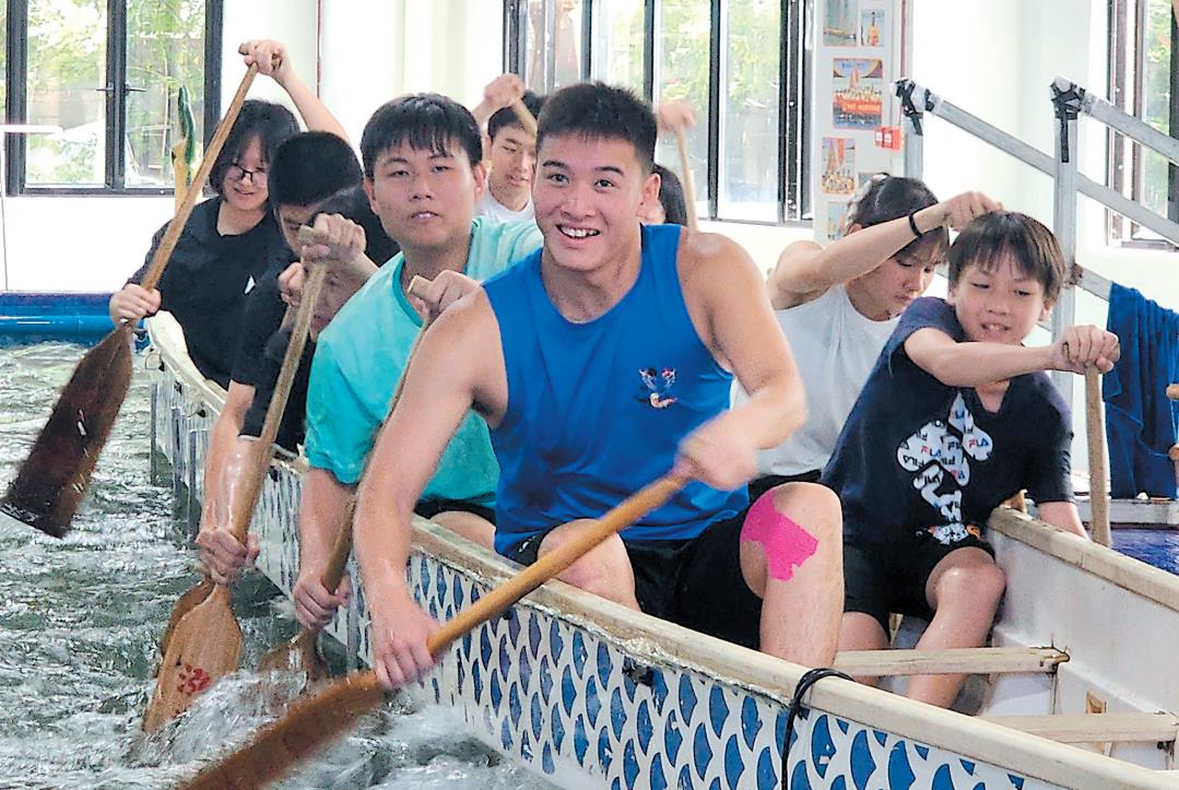 香港裘錦秋中學龍舟隊隊員與新會泓達堂陳皮龍舟隊隊員一起訓練扒龍舟。