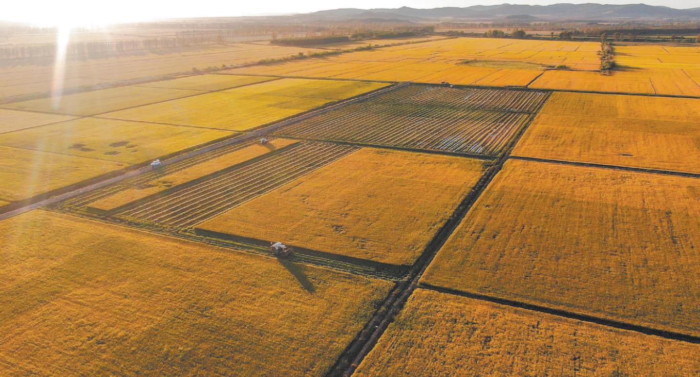 9月10日,在北大荒集團黑龍江共青農(nóng)場有限公司河北莊管理區(qū)水稻地塊,農(nóng)機手駕駛割曬機進行割曬作業(yè)(無人機照片)。