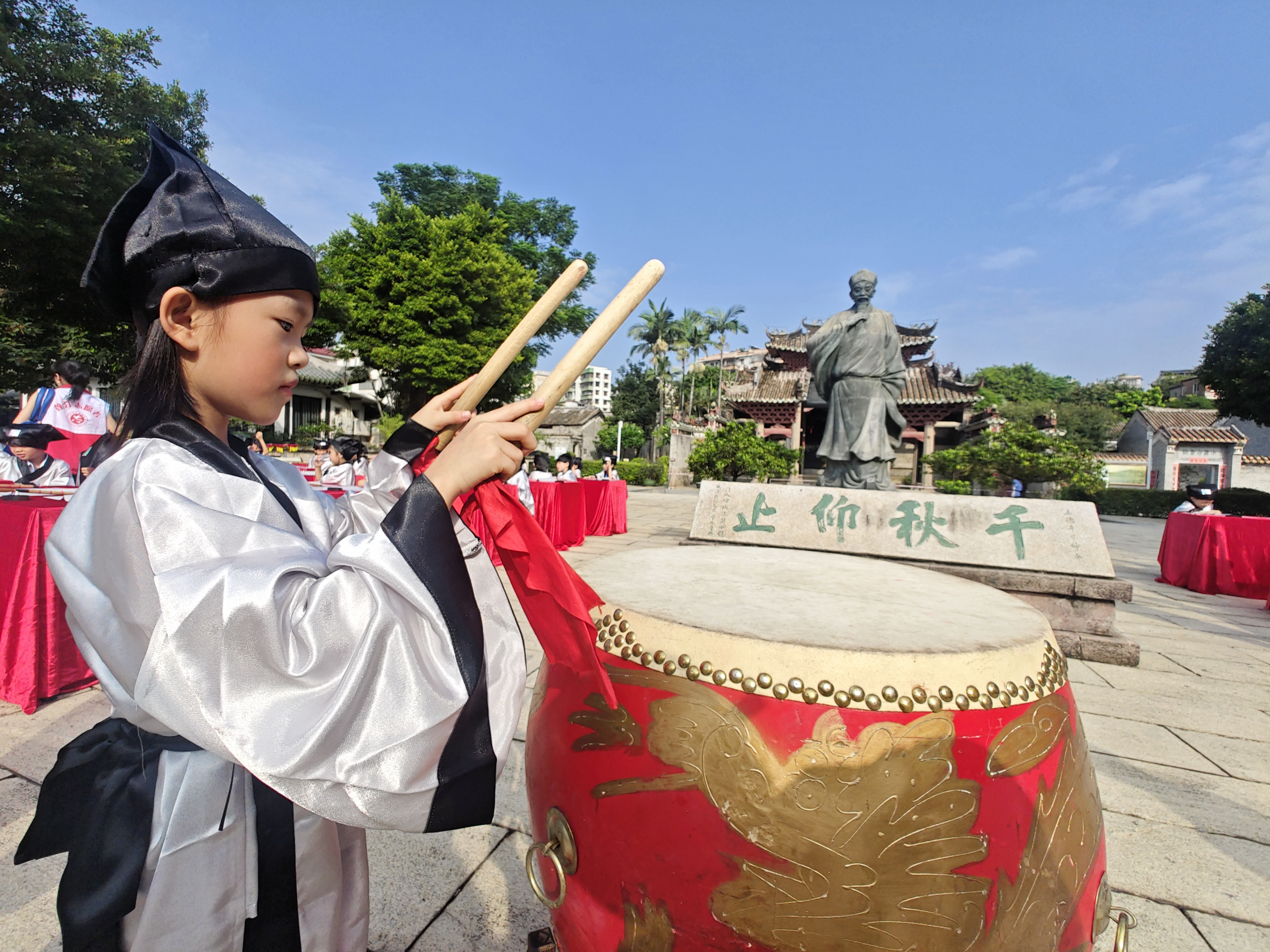 ??? 此次活動主題為“開筆延脈 詩禮傳家”。儀式上,正衣冠、拜白沙先生像(拜先師)、朱砂啟智、擊鼓鳴志、啟蒙描紅、誦讀經(jīng)典、行謝禮等環(huán)節(jié)逐項進行。在嶺南大儒陳白沙先生的講學(xué)之地,身著漢服的孩子們通過體驗傳統(tǒng)禮節(jié)、傾聽圣賢教誨,汲取傳統(tǒng)文化中積極向上的思想觀念、人文精神和傳統(tǒng)美德,培養(yǎng)優(yōu)良品德。