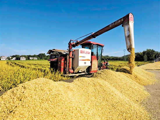??? 記者近日在臺山市白沙鎮(zhèn)看到,稻田里金黃的稻浪隨風(fēng)起伏,一片片滿目金黃、層層疊疊的稻穗顆粒飽滿;農(nóng)機手駕駛著收割機在金色的稻浪中來回穿梭作業(yè),一排排水稻被整齊地割下,經(jīng)過脫粒、分離等流程,直接輸送到田邊的曬場上。機聲隆隆、稻香陣陣,金黃稻田與美麗鄉(xiāng)村相互映襯,構(gòu)成一幅幅靚麗的田園畫卷。