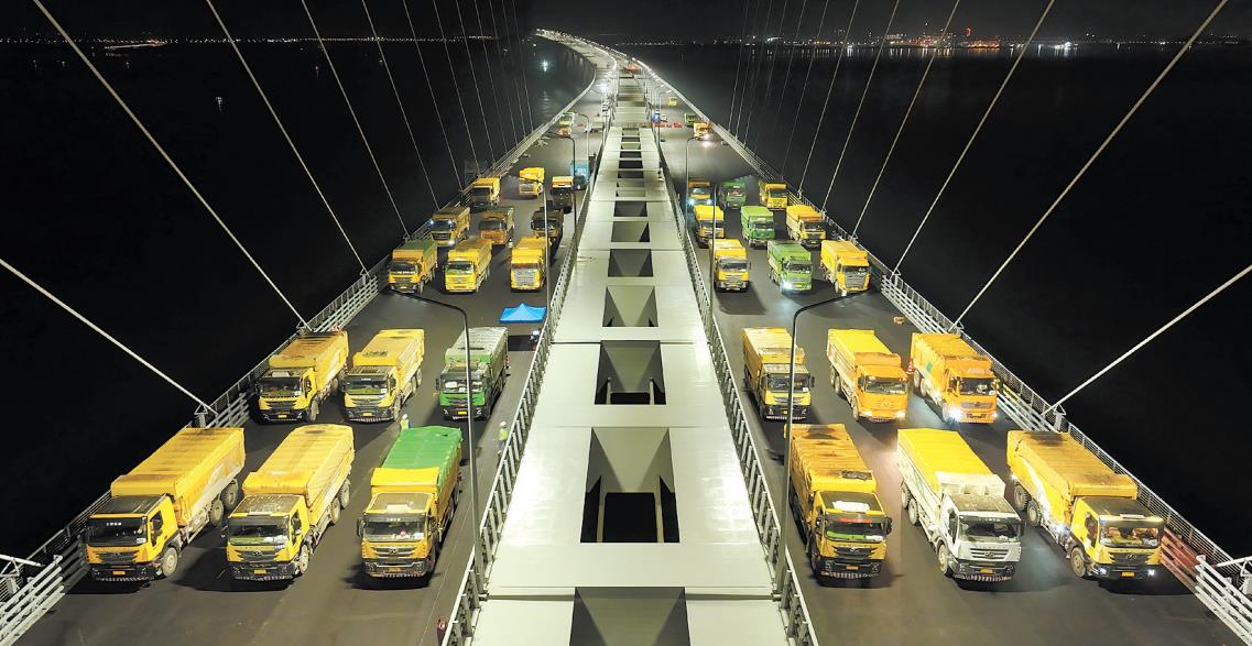????江門日報(bào)訊 (文/圖 畢松杰 粵交集宣 張鳴子) 11月14日,廣東交通集團(tuán)發(fā)布消息,黃茅海跨海通道項(xiàng)目黃茅海大橋荷載試驗(yàn)完成,54輛載重共1890噸的汽車分四次加載,最終穩(wěn)穩(wěn)停在橋面上(右圖)。項(xiàng)目另一座主橋高欄港大橋已于11月5日完成荷載試驗(yàn),至此,項(xiàng)目橋梁工程通過“深度體檢”,為順利通車再添關(guān)鍵一筆。