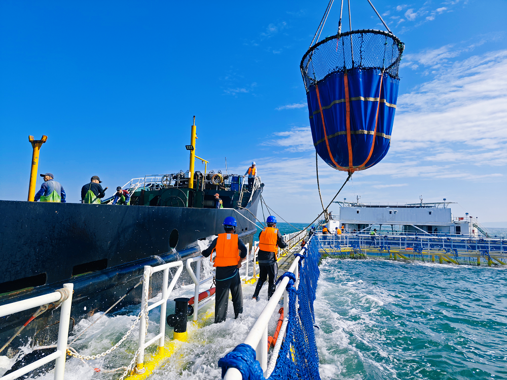 ????陽光灑落,上川島海域波光粼粼?!芭_(tái)山1號(hào)”巍然屹立,3個(gè)巨大的網(wǎng)箱中,數(shù)萬條鮸魚歡快地穿梭其間。此時(shí),滿載著新一批鮸魚良種的運(yùn)輸船緩緩駛來,與“臺(tái)山1號(hào)”并肩而立,在工作人員的操作下,這些承載著希望的鮸魚良種陸續(xù)被投放進(jìn)網(wǎng)箱。