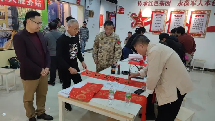 近日,蓬江區(qū)在白沙街道退役軍人服務(wù)站組織開展“關(guān)愛軍人送春聯(lián)、情暖老兵送祝福”主題活動,邀請廣東省硬筆書法協(xié)會書法家集中街道退役軍人服務(wù)站書寫春聯(lián),向轄區(qū)內(nèi)退役軍人和其他優(yōu)撫對象現(xiàn)場書送春聯(lián),并把新春的祝福送到了轄區(qū)抗美援朝老兵及家屬手中,將黨和政府的關(guān)心關(guān)懷送到老兵心坎上,積極營造全社會銘記歷史、尊重退役軍人的良好社會氛圍。