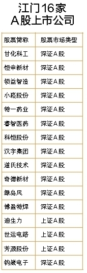????近年來(lái),隨著江門深入實(shí)施“金種子”三年行動(dòng)方案,本土資本市場(chǎng)發(fā)展態(tài)勢(shì)良好,市場(chǎng)主體量質(zhì)同升,市場(chǎng)韌性不斷增強(qiáng)。目前,我市共有A股上市公司16家,總市值1350.45億元,在全省排在第9位。按行業(yè)劃分,涉及電子、化工、機(jī)械設(shè)備、家用電器、生物醫(yī)藥、國(guó)防軍工等;以產(chǎn)業(yè)鏈歸類,主要集中在新能源汽車及零部件、新能源電池、新一代信息技術(shù)、石化新材料、家電、生物醫(yī)藥等我市重點(diǎn)布局發(fā)展的產(chǎn)業(yè)鏈條,且多處于中上游環(huán)節(jié),“硬科技”實(shí)力突出,新質(zhì)生產(chǎn)力發(fā)展動(dòng)能強(qiáng)勁。