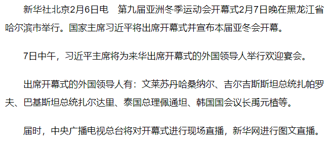 習近平將出席哈爾濱第九屆亞洲冬季運動會開幕式并舉行外事活動