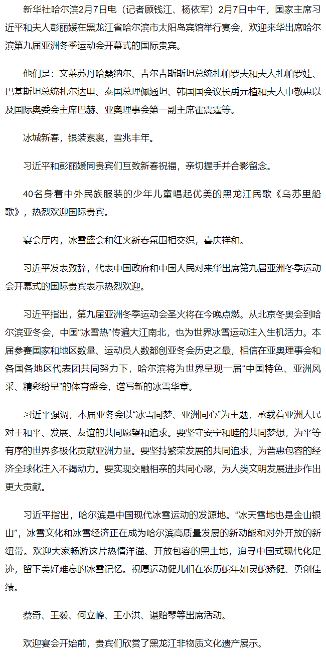 習(xí)近平和彭麗媛為出席哈爾濱第九屆亞洲冬季運動會開幕式的國際貴賓舉行歡迎宴會