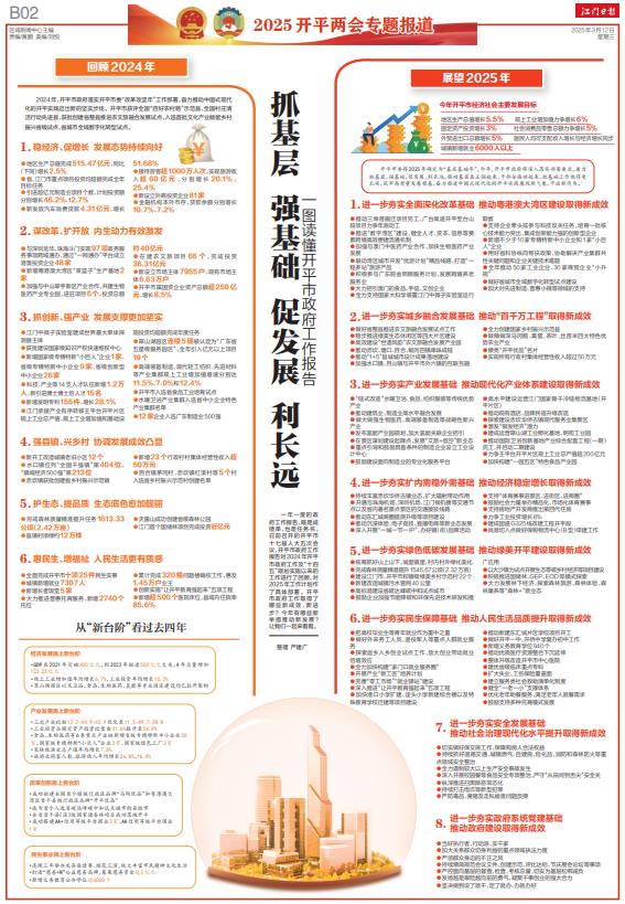 ????一年一度的政府工作報告,既是成績單,也是任務(wù)書。日前召開的開平市十七屆人大五次會議,開平市政府工作報告對2024年開平市政府工作及“十四五”規(guī)劃實施以來的工作進(jìn)行了回顧,對2025年工作計劃作了具體部署。開平市政府工作取得了哪些新成效、新進(jìn)步?今年有哪些新舉措推動新發(fā)展?讓我們一起來看看。