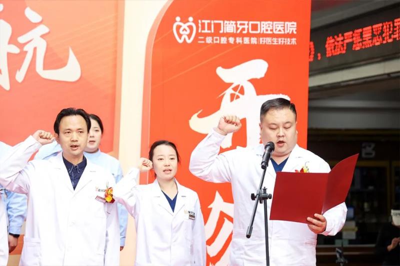在江門簡(jiǎn)牙口腔醫(yī)院醫(yī)療院長(zhǎng)栗晗的帶領(lǐng)下,簡(jiǎn)牙醫(yī)護(hù)團(tuán)隊(duì)列隊(duì)而立,莊嚴(yán)起誓:恪守醫(yī)道,精進(jìn)技藝,讓每一次診療都經(jīng)得起良知的叩問;以心相待,以誠(chéng)相交,讓每一份托付都值得生命的重托;用溫暖化解恐懼,以專業(yè)守護(hù)信任,讓每一張笑臉都綻放自信光彩。