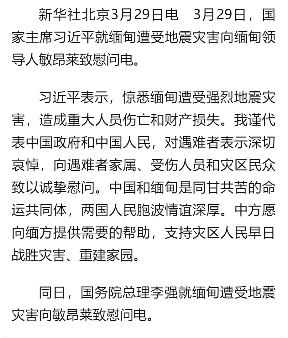 習(xí)近平就緬甸遭受地震災(zāi)害向緬甸領(lǐng)導(dǎo)人敏昂萊致慰問(wèn)電