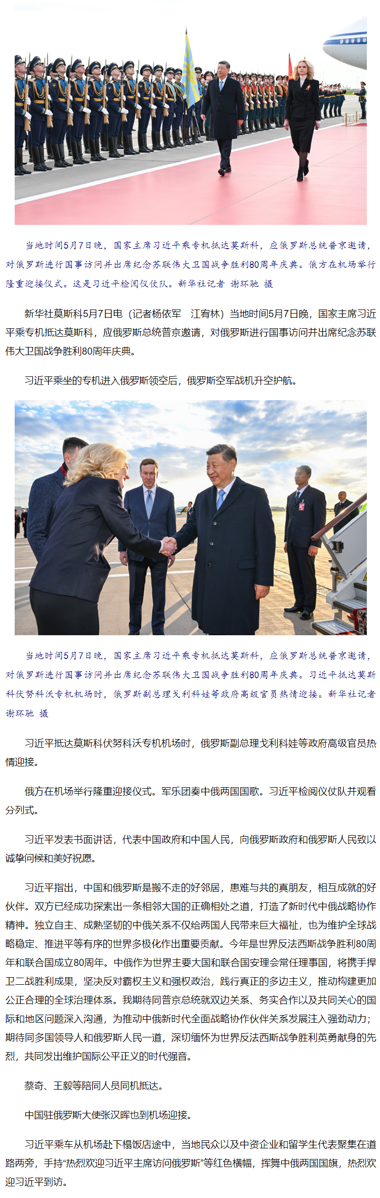 習(xí)近平抵達(dá)莫斯科對(duì)俄羅斯進(jìn)行國(guó)事訪(fǎng)問(wèn)并出席紀(jì)念蘇聯(lián)偉大衛(wèi)國(guó)戰(zhàn)爭(zhēng)勝利80周年慶典