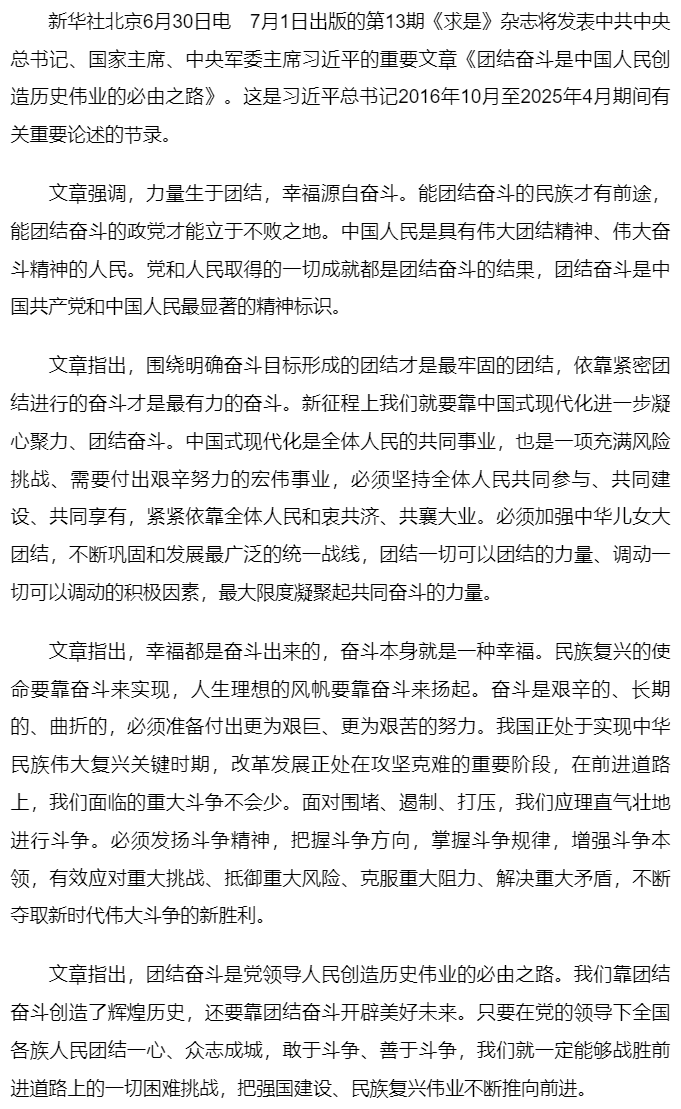 《求是》雜志發(fā)表習(xí)近平總書記重要文章《團(tuán)結(jié)奮斗是中國(guó)人民創(chuàng)造歷史偉業(yè)的必由之路》