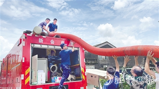 ????應(yīng)急隊伍攜帶“龍吸水”子母排洪車、大流量泵車等排澇裝備,分批到雙水鎮(zhèn)東凌村、新會智造產(chǎn)業(yè)園大澤園區(qū)、圭峰會城七堡工貿(mào)城社區(qū)等多處開展排澇搶險。