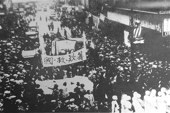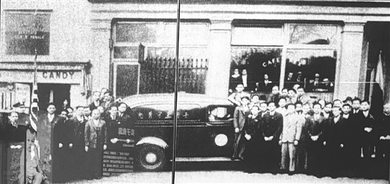 抗戰(zhàn)爆發(fā)后,旅美華僑在紐約唐人街舉行籌款救國大會,勸募獻金支援祖國抗戰(zhàn)。