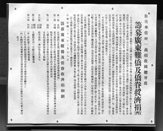 中國僑都華僑華人博物館館藏《旅美華僑統(tǒng)一義捐救國總會為籌募廣東難僑及僑眷救濟捐宣言》。