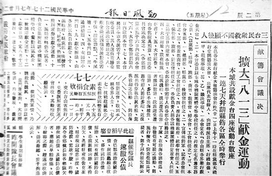 ????該報另一篇報道為《本城獻金臺?第五天獻金錄》。文中詳細記錄了獻金的地點、人物、獻金的數(shù)額:“革新路(十七日)臺山自衛(wèi)集訓大隊國幣七十二元六毫另廣東銅仙六枚、六歲小童饒棣棣毫券六毫……漢師奶毫券三十元、臺山造餅工會毫券十元、臺師附小省幣十元、譚達鋈紋銀戒指一枚……女師附?。ㄊ呷眨┡_城消防隊國幣五元、遠怡母省券一元、譚華盛紋銀頸鉗一只……”