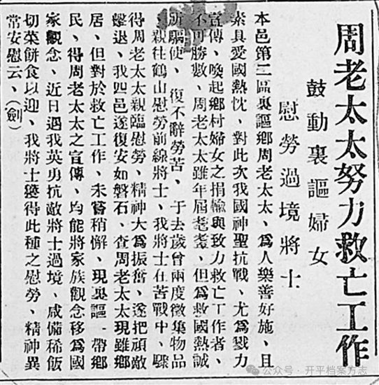 1939年《開平日報》報道“周老太太”方玉蓮(左圖)參與抗日救亡工作。