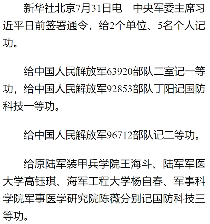 中央軍委主席習(xí)近平簽署通令 給2個(gè)單位、5名個(gè)人記功