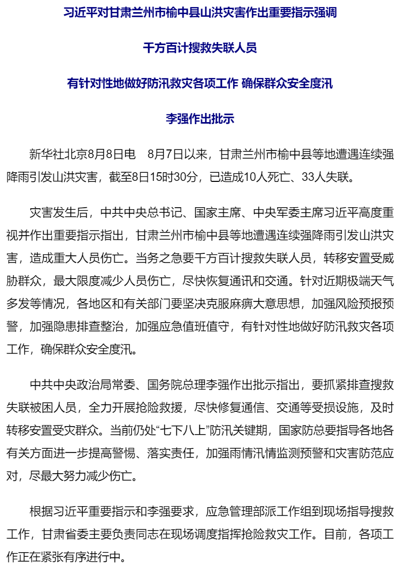 習(xí)近平對(duì)甘肅蘭州市榆中縣山洪災(zāi)害作出重要指示