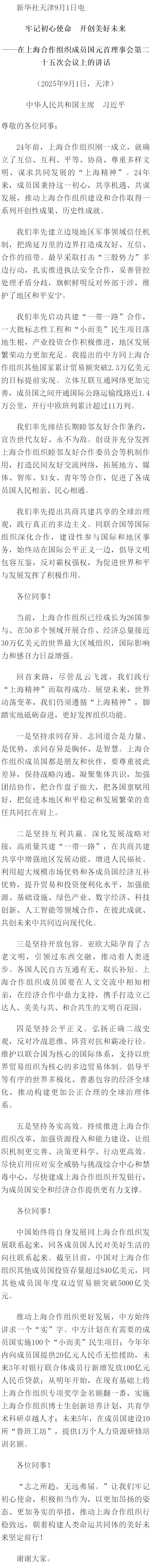 上合組織天津峰會(huì)|習(xí)近平在上海合作組織成員國(guó)元首理事會(huì)第二十五次會(huì)議上的講話(全文)