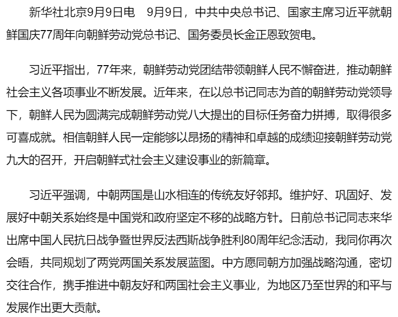 習(xí)近平就朝鮮國慶77周年向朝鮮最高領(lǐng)導(dǎo)人金正恩致賀電