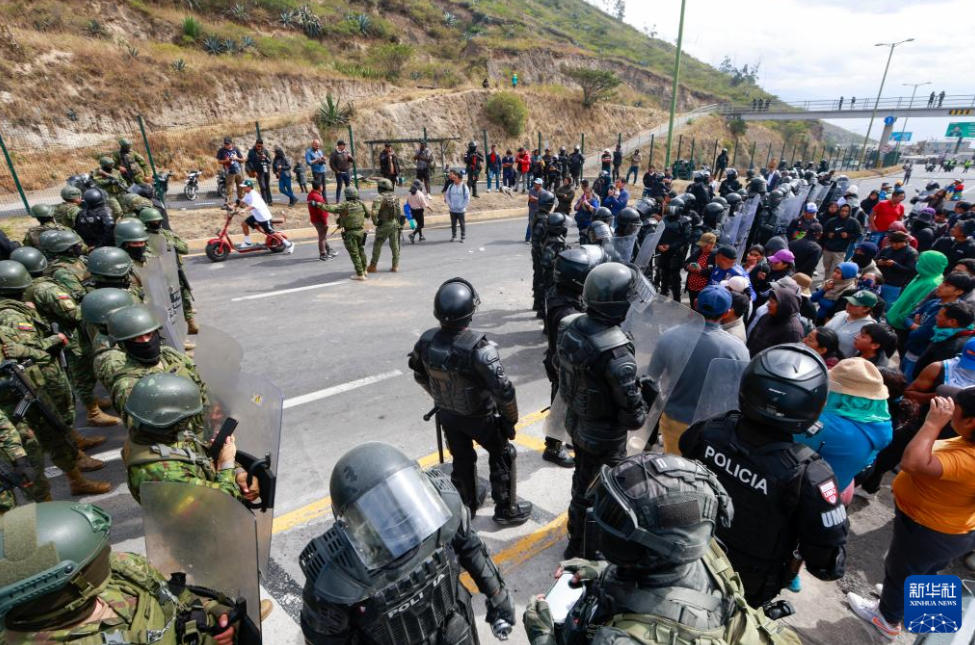 ??9月16日,在厄瓜多爾首都基多,武裝部隊(duì)人員和警察在道路上維持秩序。新華社發(fā)(里卡多·蘭德塔攝)