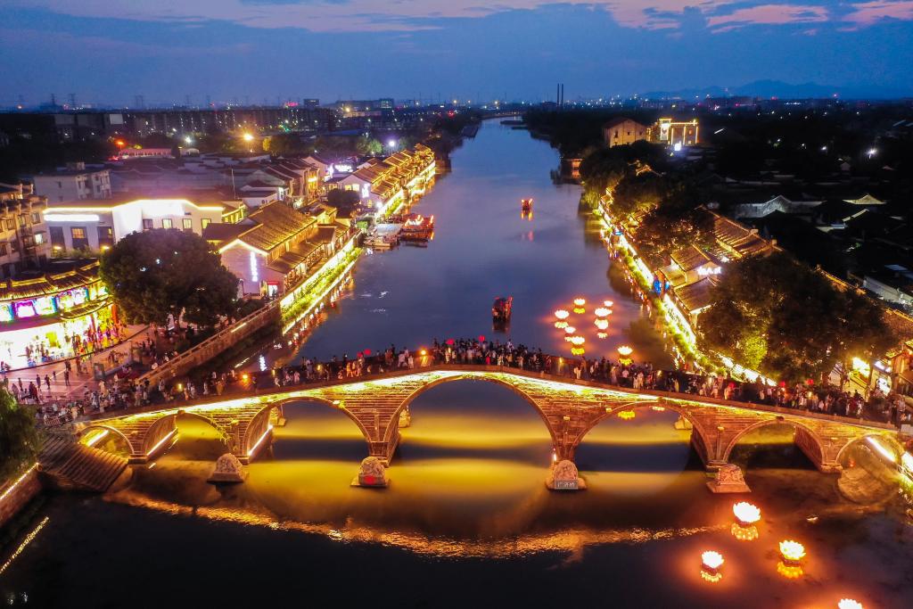 10月2日,游客在塘棲古鎮(zhèn)的廣濟(jì)橋觀賞運(yùn)河夜景(無(wú)人機(jī)照片)。新華社記者 徐昱 攝