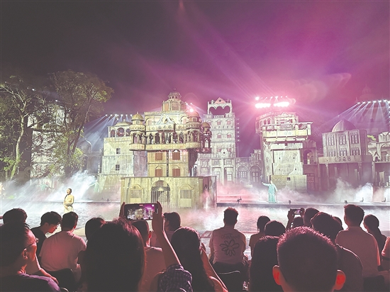 ????晚上8時(shí)30分,赤坎華僑古鎮(zhèn)的晚風(fēng)裹著僑鄉(xiāng)煙火氣,人流循著燈光向水劇場(chǎng)聚攏。不過(guò)半小時(shí),劇場(chǎng)內(nèi)5000余個(gè)座位便座無(wú)虛席,觀眾手中的手機(jī)鏡頭已悄悄對(duì)準(zhǔn)舞臺(tái)——大家等候的,正是能讓開(kāi)平碉樓故事“穿越時(shí)空”的《火秀》。