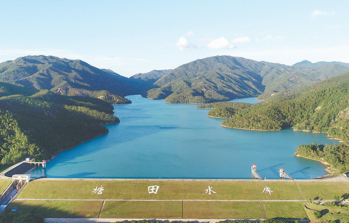 臺(tái)山全市水庫(kù)蓄水總量達(dá)4.67億立方米,較常年同期偏多34%。圖為蓄水的塘田水庫(kù)。