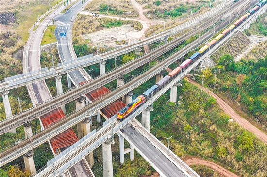 ????圖為當(dāng)日,鐵海聯(lián)運(yùn)“重慶造”新能源汽車(chē)專(zhuān)列在重慶果園港魚(yú)嘴站順利發(fā)車(chē)(無(wú)人機(jī)照片)。新華社發(fā)