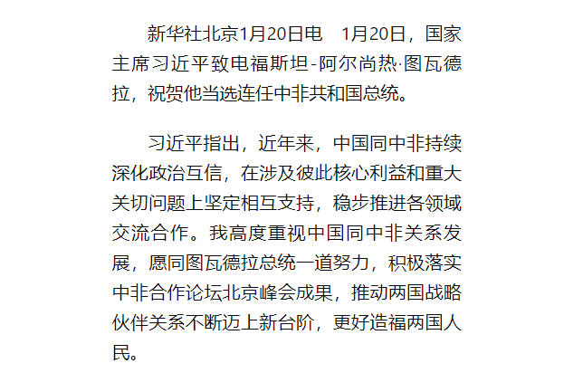 習近平致電祝賀圖瓦德拉當選連任中非共和國總統(tǒng)