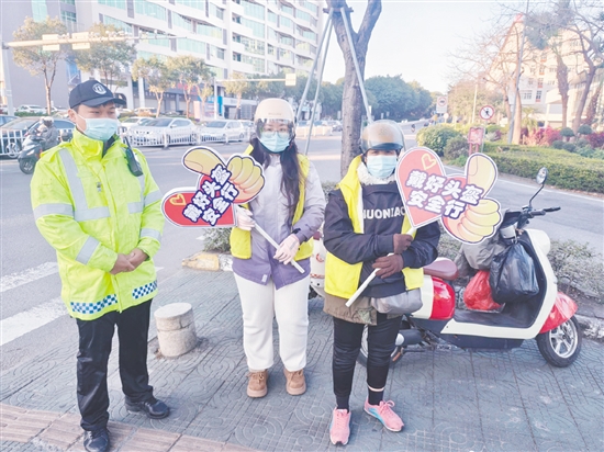 近日在江門不少路口,一些手舉“戴好頭盔安全行”“摩電靠右你最棒”“駕駛摩托車電動車請戴頭盔靠右行”等提示牌、勸導旗的人吸引了過往群眾的目光,這些人并不是志愿者,而是輕微交通違法人員。