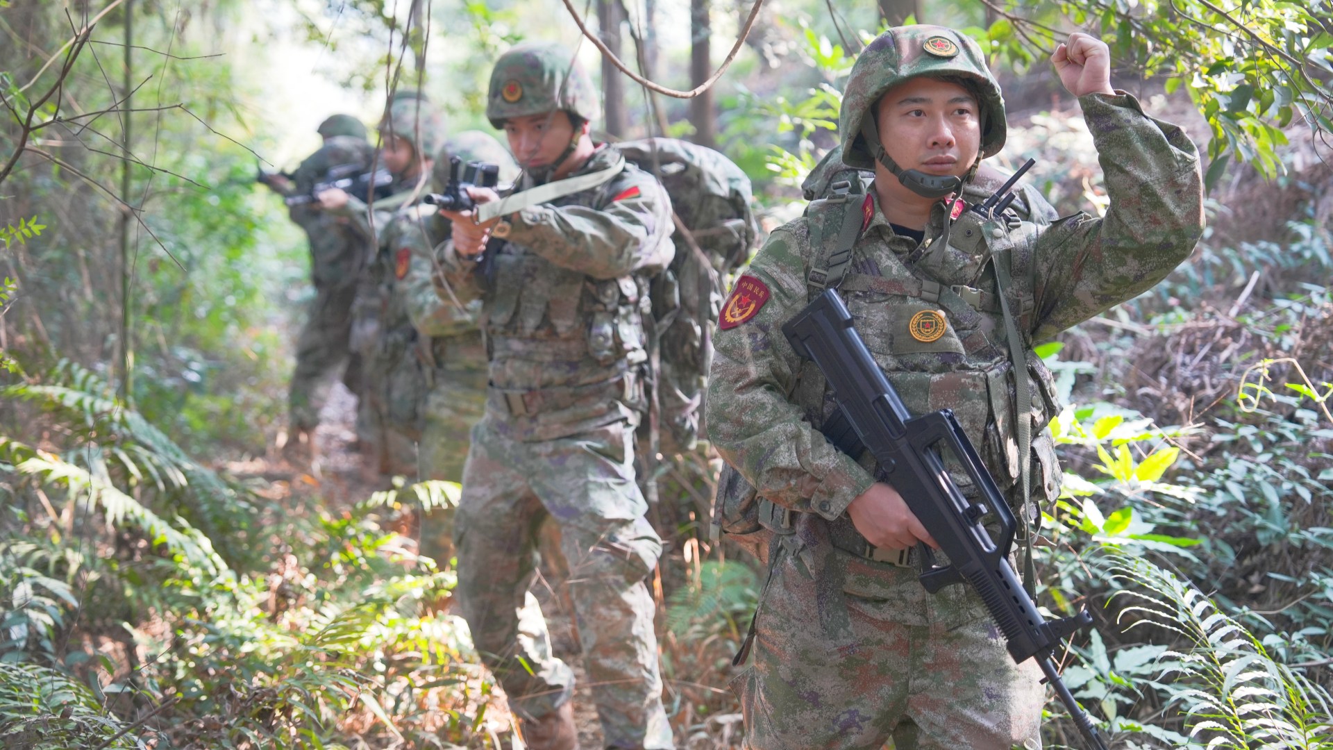 鶴山市人武部組織隊員在林地模擬實戰(zhàn)訓(xùn)練。