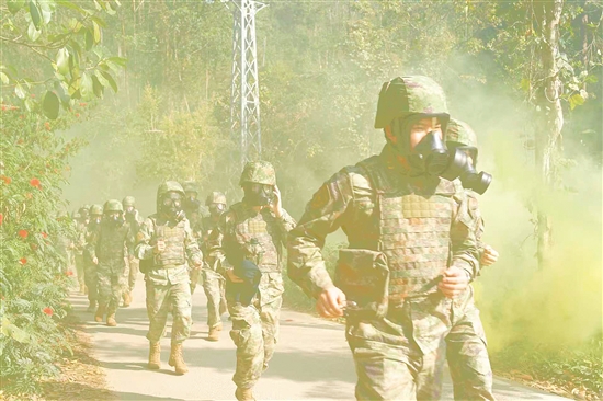 參訓(xùn)隊員佩戴防毒面具模擬穿越染毒地帶。