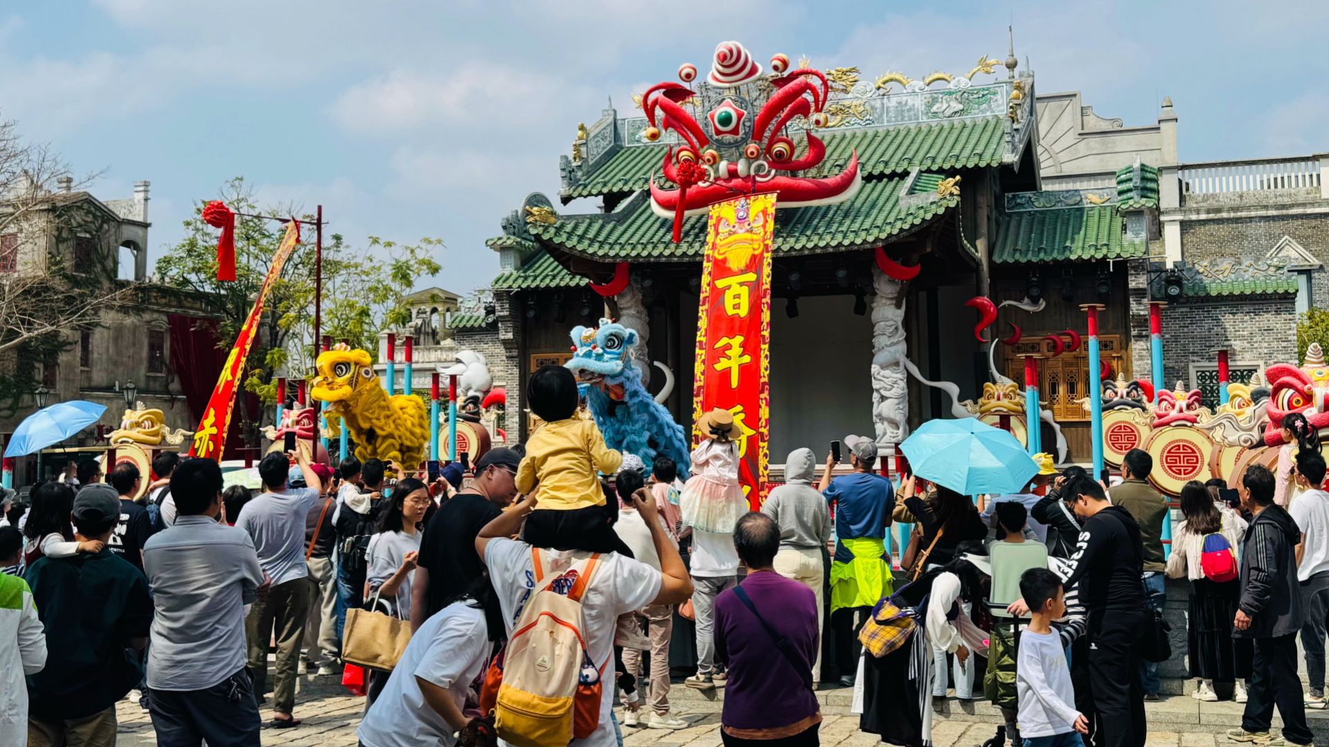 大年初七早上,他們又來(lái)到赤坎華僑古鎮(zhèn)。相較于假期高峰時(shí)一天有5萬(wàn)多人的熱鬧,春節(jié)假期最后一天的景區(qū)格外“友好”。不用排隊(duì)等候,一家人走走停停,在騎樓下拍照,在池塘邊喂錦鯉,從容又愜意。更讓人驚喜的是,景區(qū)里的簕杜鵑開(kāi)得正盛,嫣紅的花朵鋪滿(mǎn)墻頭,整個(gè)古鎮(zhèn)仿佛被鮮花包裹。隨處可見(jiàn)的馬年花牌、喜慶的新年裝飾,讓年味愈發(fā)濃厚,雄獅少年的精彩表演、驚險(xiǎn)刺激的環(huán)球飛車(chē),更是讓孩子們看得目不轉(zhuǎn)睛。