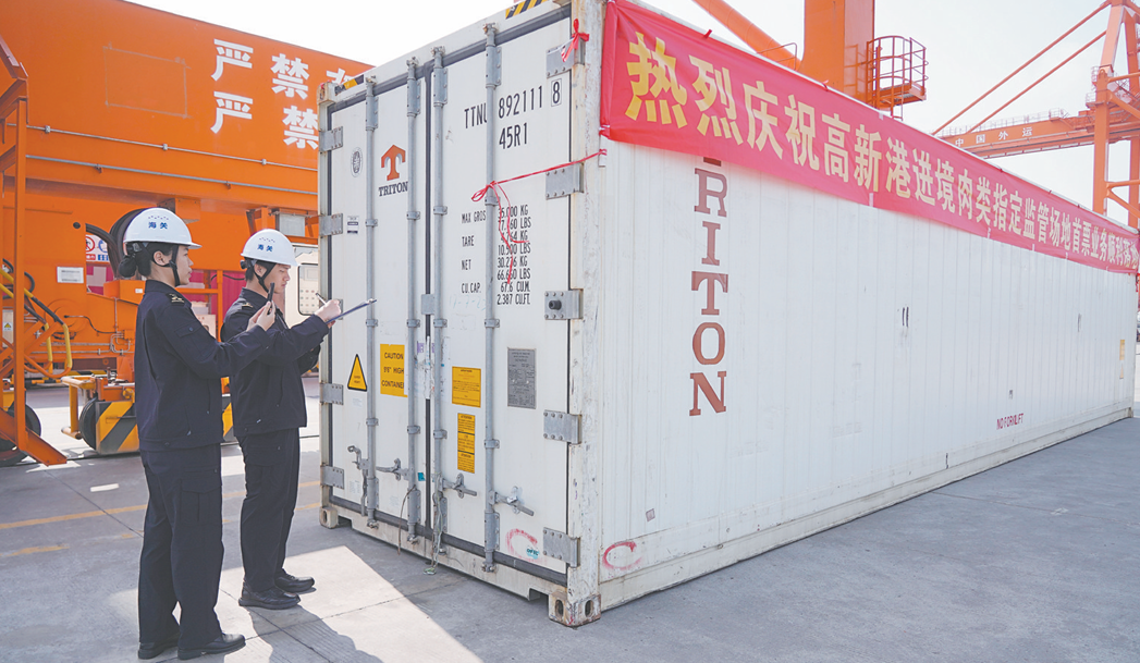 ????江門日?qǐng)?bào)訊 (文/圖 記者/凌雪敏 何榕) 3月11日,江門高新港進(jìn)境肉類指定監(jiān)管場(chǎng)地迎來首票業(yè)務(wù)通關(guān):一批自英國啟運(yùn)、重72.6噸、總值超150萬元的冷凍豬手,在運(yùn)抵江門高新港后,經(jīng)江門海關(guān)所屬外海海關(guān)監(jiān)管順利放行。這標(biāo)志著該指定監(jiān)管場(chǎng)地正式投入運(yùn)營,也意味著江門在構(gòu)建高水平對(duì)外開放新格局、賦能本地農(nóng)產(chǎn)品基地建設(shè)上邁出關(guān)鍵一步。????“從貨物抵港到完成查驗(yàn),流程非常順暢?!笔灼睒I(yè)務(wù)進(jìn)口商、恩平市云合貿(mào)易進(jìn)出口有限公司總經(jīng)理馬小紅表示,過去進(jìn)口豬肉需從廣州南沙、深圳鹽田等口岸入境,江門高新港進(jìn)境肉類指定監(jiān)管場(chǎng)地啟用后,如今貨物經(jīng)香港轉(zhuǎn)運(yùn)后,可以直接在江門“直提上岸”,清關(guān)完成后即可運(yùn)往本地冷庫,再銷往全國?!疤嶝浰俣瓤炝苏惶?,在家門口有了冷庫,也省去了異地倉儲(chǔ)費(fèi)用?!彼硎?,專業(yè)的冷鏈設(shè)施與高效的通關(guān)服務(wù),有力保障了肉品品質(zhì),也為企業(yè)拓展業(yè)務(wù)增添了信心。