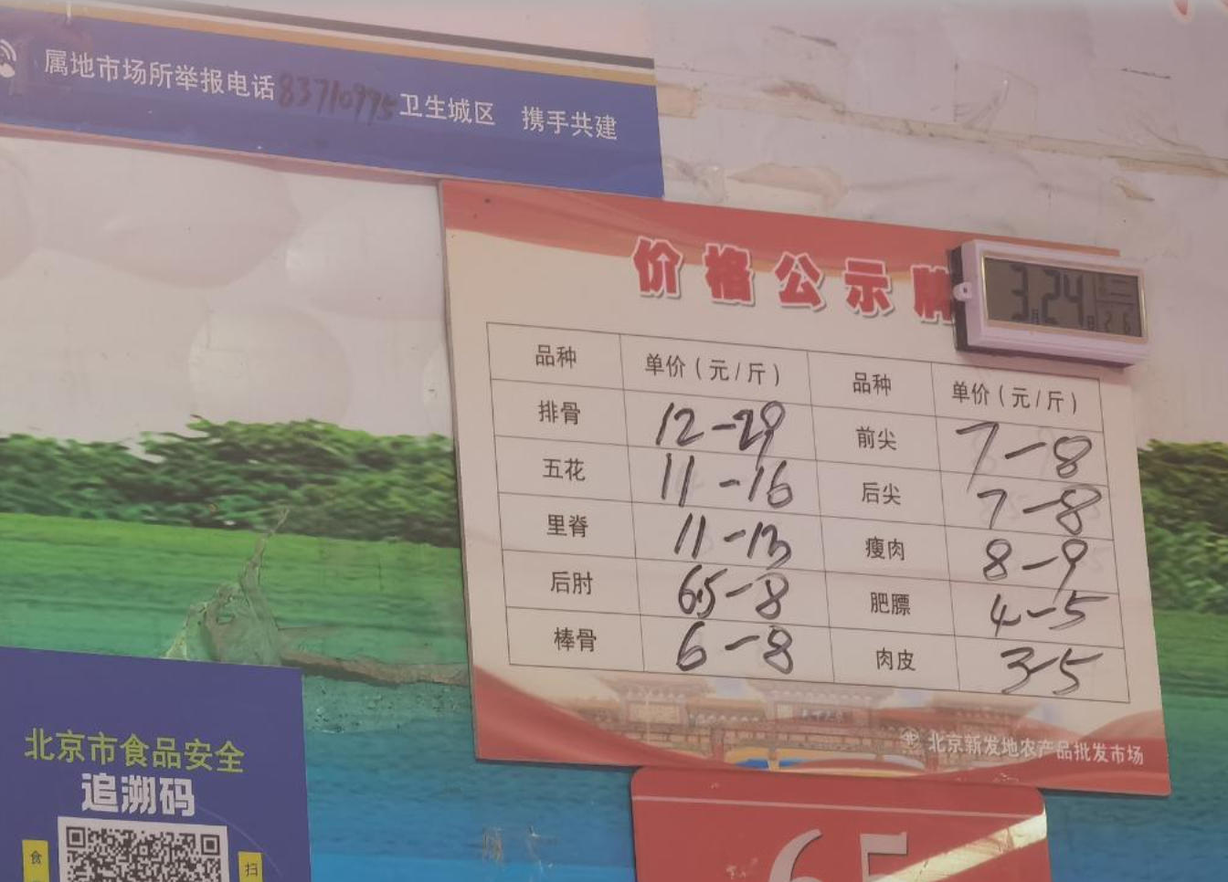 這是3月24日在北京新發(fā)地肉類(lèi)交易大廳拍攝的一塊豬肉價(jià)格公示牌。新華社記者 古一平 攝