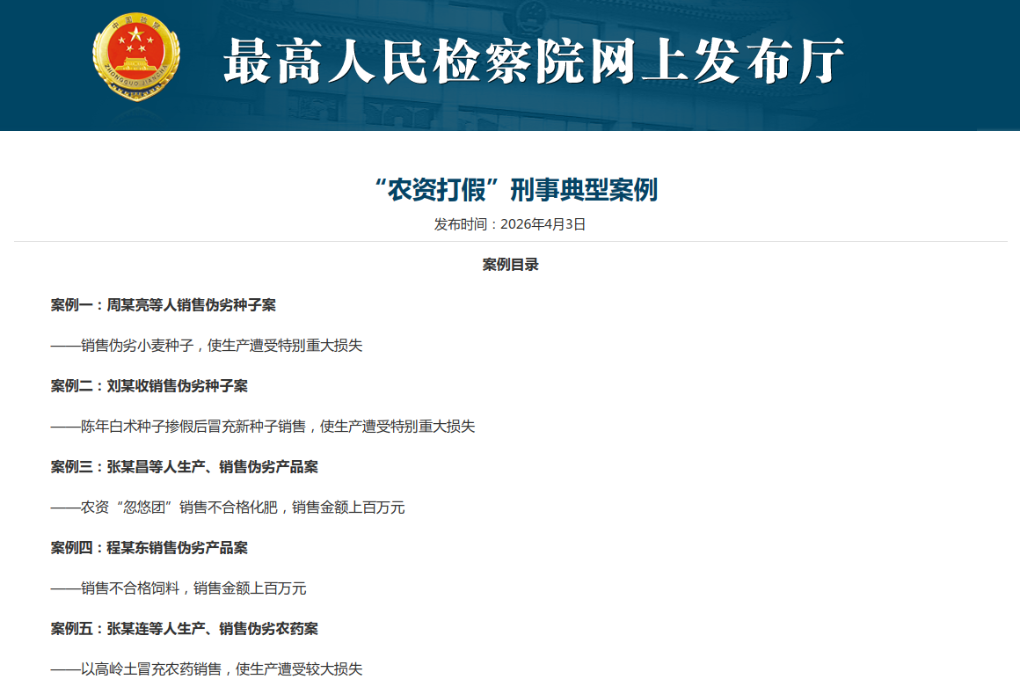 最高人民法院、最高人民檢察院4月3日聯(lián)合發(fā)布5個(gè)“農(nóng)資打假”刑事典型案例,涵蓋種子、農(nóng)藥、化肥、飼料等4大類農(nóng)資產(chǎn)品。