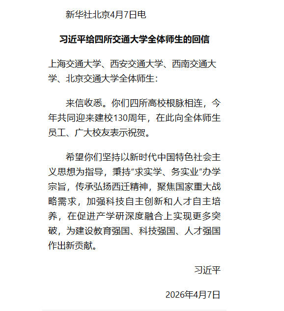 習(xí)近平給四所交通大學(xué)全體師生的回信