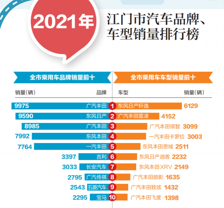 ????是哪一輛車的出現(xiàn),滿足了你對(duì)美好生活的期待?是哪一個(gè)品牌的扎根,打動(dòng)了你原本平靜的心?買車雖好,但選車有講究。近日,本報(bào)從市稅務(wù)局獲取了2021年各汽車品牌、車型在江門地區(qū)的新增數(shù)據(jù),并進(jìn)行統(tǒng)計(jì)分析,獨(dú)家發(fā)布2021年各大汽車品牌、車型在五邑地區(qū)的銷售數(shù)據(jù)(限乘用車),供廣大消費(fèi)者參考。
